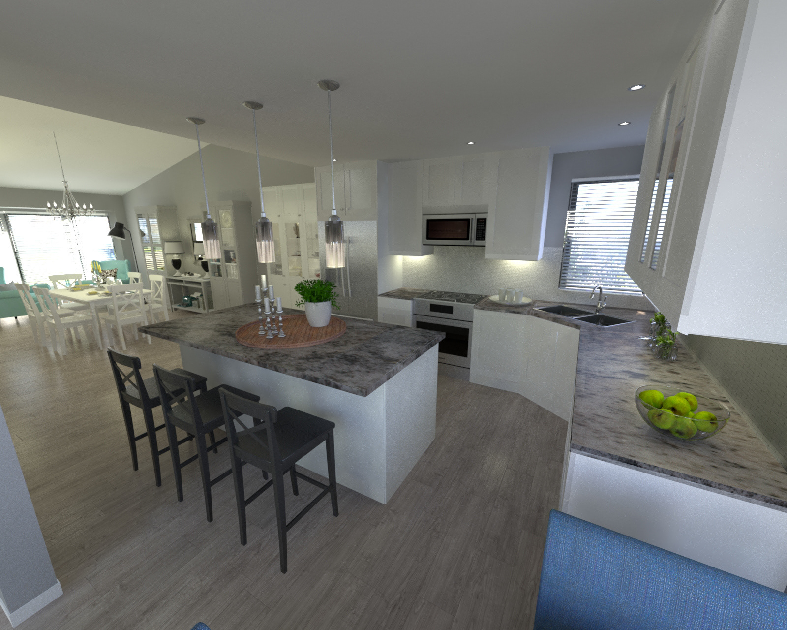 The kitchen, once enclosed and dated, now serves as the heart of the home — a functional showpiece defined by crisp white cabinetry, statement pendant lighting, and generous work surfaces. The oversized island provides both casual seating and a natural gathering point, while layered lighting enhances the marble-inspired countertops and subtle textures. Clean geometry and soft contrast establish a fresh, modern rhythm that complements the home’s architecture.