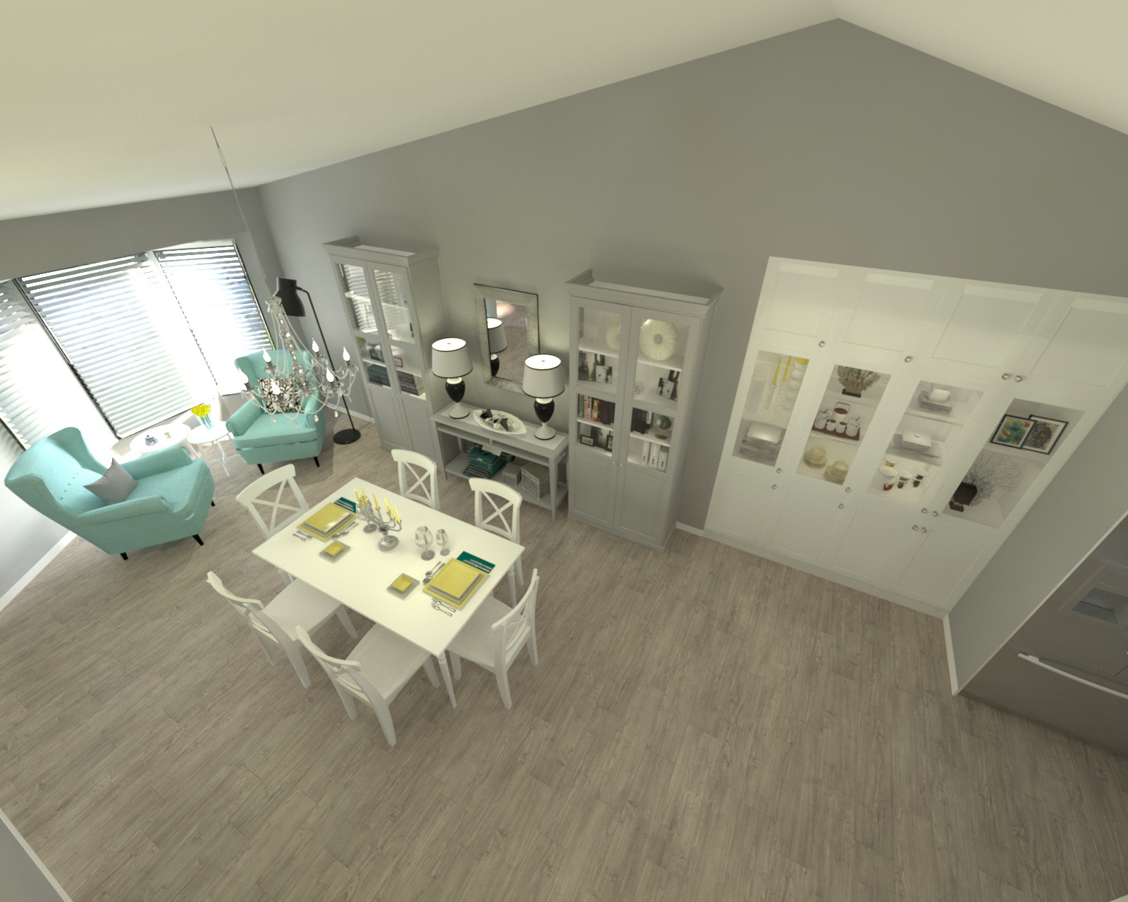 The dining area was designed as both a visual anchor and a social centerpiece. Neutral foundations are accented by light teal tones and warm metallic details, creating a sense of effortless elegance. Statement lighting adds sculptural character above the table, while the integration of built-in storage ensures practicality without compromising aesthetic clarity. The continuity of flooring and finishes reinforces flow and cohesion across spaces.