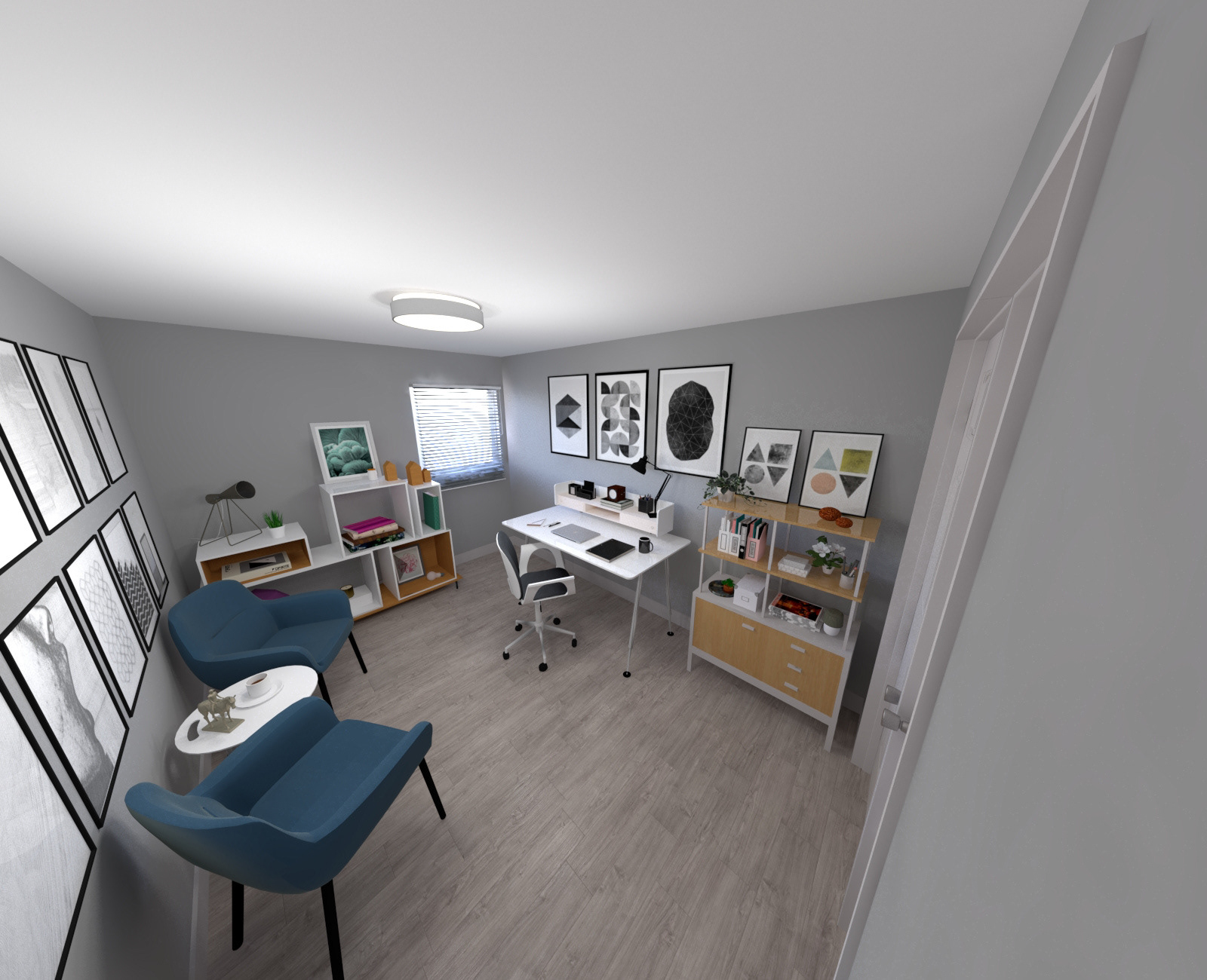 The home office was crafted as a bright, inspiring environment designed for focus and creativity. Neutral surfaces provide clarity, while art prints and contemporary furniture add visual interest. The layout supports both productivity and relaxation, featuring a mix of open shelving, soft seating, and tactile materials that elevate everyday work.